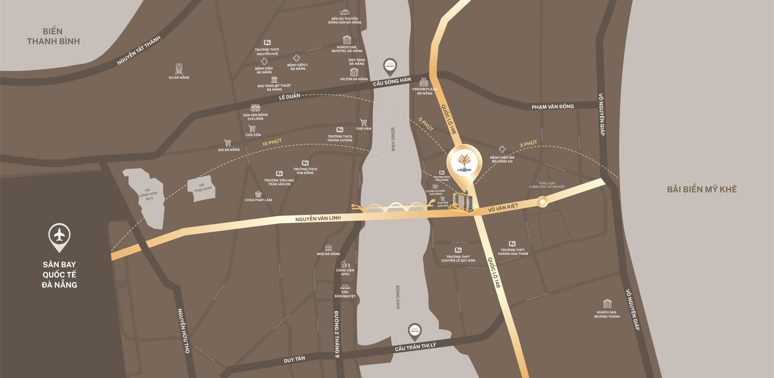 Từ The Legend, cư dân có thể dễ dàng di chuyển đến các điểm nổi tiếng như bán đảo Sơn Trà, biển Phạm Văn Đồng, bãi Mỹ An, Asia Park, chợ Hàn, Vincom Plaza… Vị trí này không chỉ thích hợp để an cư mà còn lý tưởng cho khai thác cho thuê khi thu hút lượng lớn khách du lịch trong và ngoài nước.